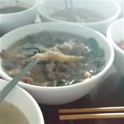 7.肉片入沸水汤汁中用筷子划散,再次煮沸后肉片连汤一起倒入垫有蔬菜的碗中。