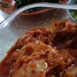 6. 煮好的肉片倒进铺有圆白菜的大碗中。