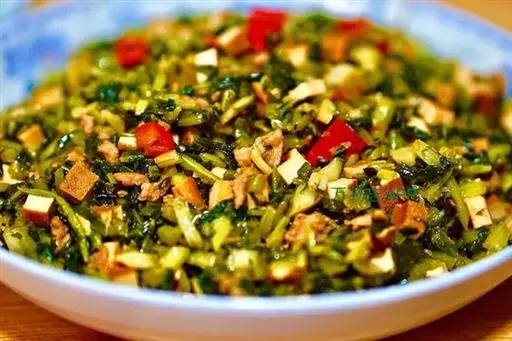 2.芹菜、蒜苗、豌 豆类可用元自菜叶代之,将元白菜撕成大片,一同下入锅内烧至入味,盖在肉片上面风味尤佳。