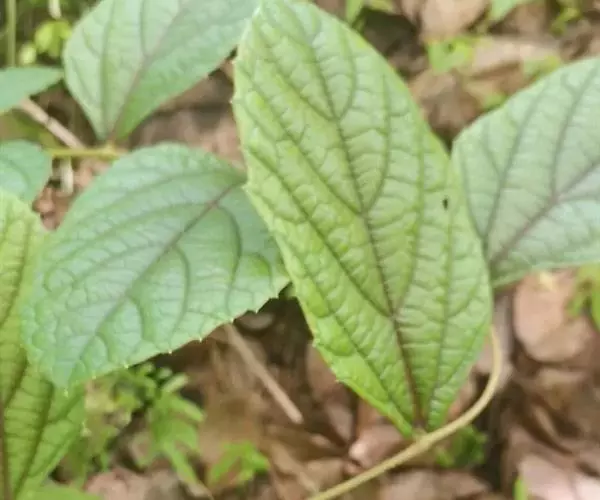 常绿藤本植物。小枝圆柱形,有纵棱纹,密被褐色长柔毛。卷须2叉分枝或不分枝,疏被褐色柔毛,每隔2节间断与叶对生。叶菱状卵形或菱状长椭圆形,不分裂,稀3裂,长3.5-13厘米,宽2-7厘米,顶端急尖,基部常不对称,楔形或阔楔形,稀下部叶基部近圆形,边缘每侧有6-12个粗锯齿,齿尖锐,稀钝,上面暗绿色,仅中脉上伏生疏短柔毛,下面绿色,疏生淡褐色柔毛,基生脉3出,中脉有侧脉3-5对,网脉在上面不明显, 下面微突出;叶柄长0.2-3厘米,下部叶常有较长的叶柄,长达1.5厘米,被淡褐色长柔毛;托叶膜质,褐色,三角状披针形,长2-4毫米,宽1-1.5毫米,顶端渐尖,边缘全缘,无毛或基部疏生缘毛。花杂性异株,圆锥花序疏散,与叶对生,下部分枝不发达,长2.5-5.5厘米,花序梗长1-2厘米,密被淡褐色长柔毛;花梗长1.5-2毫米,无毛;花蕾倒卵圆形,高1.2-1.5毫米,顶端圆形;萼碟形,全缘,高0.1-0.2毫米,无毛;花瓣5,呈帽状粘合脱落;雄蕊5,花丝丝状,长0.5-1毫米,花药黄色,卵圆形或卵椭圆形,长0.5-0.6毫米,在雌花内雄蕊显著短,败育;花盘发达,5裂;雌蕊1,子房卵圆形,花柱短,柱头扩大。果实圆球形,直径0.6-0.8厘米;种子倒卵形,顶端微凹,基部有短喙,种脐在种子背面中部呈椭圆形,腹面中棱脊突出,两侧洼穴较宽,椭圆形,向上达种子1/4处。花期4-5月,果期5-6月。