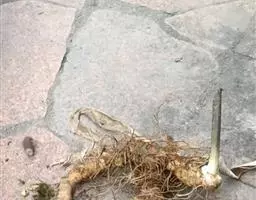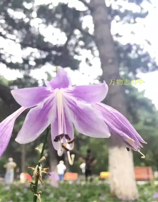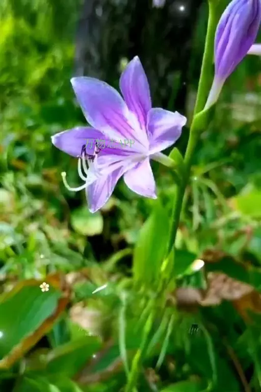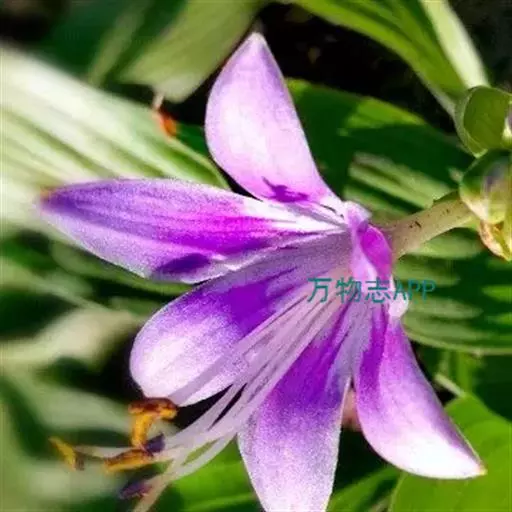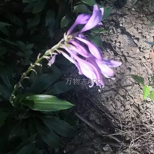 根状茎粗约1厘米,有长的走茎。叶矩圆状披针形、狭椭圆形至卵状椭圆形,长10-15厘米,宽2-6(-7)厘米,先端近渐尖,基部楔形或钝,具5-8对侧脉;叶柄长5-26厘米,由于叶片下延而至少上部具狭翅,翅每侧宽2-5毫米。花葶高33-55厘米,具几朵至二十几朵花;苞片近宽披针形,长5-7毫米,膜质;花单生,长4-4.5厘米,盛开时从花被管向上逐渐扩大,紫色;花梗长5-10毫米;雄蕊稍伸出花被之外,完全离生。花期8月。