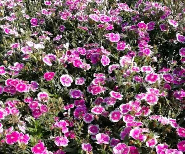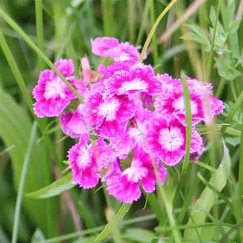 石竹,别名:兴安石竹、北石竹、钻叶石竹、蒙古石竹、丝叶石竹、高山石竹、 辽东石竹、长萼石竹、长苞石竹、林生石竹、三脉石竹,瞿麦草,拉丁文名:Dianthus chinensis L. 为双子叶植物纲、石竹科、石竹属多年生草本,高30-50厘米,全株无毛,带粉绿色。茎由根颈生出,疏丛生,直立,上部分枝。叶片线状披针形,顶端渐尖,基部稍狭,全缘或有细小齿,中脉较显。花单生枝端或数花集成聚伞花序;紫红色、粉红色、鲜红色或白色,顶缘不整齐齿裂,喉部有斑纹,疏生髯毛;雄蕊露出喉部外,花药蓝色;子房长圆形,花柱线形。蒴果圆筒形,包于宿存萼内,种子黑色,扁圆形。花期5-6月,果期7-9月。