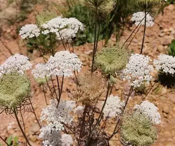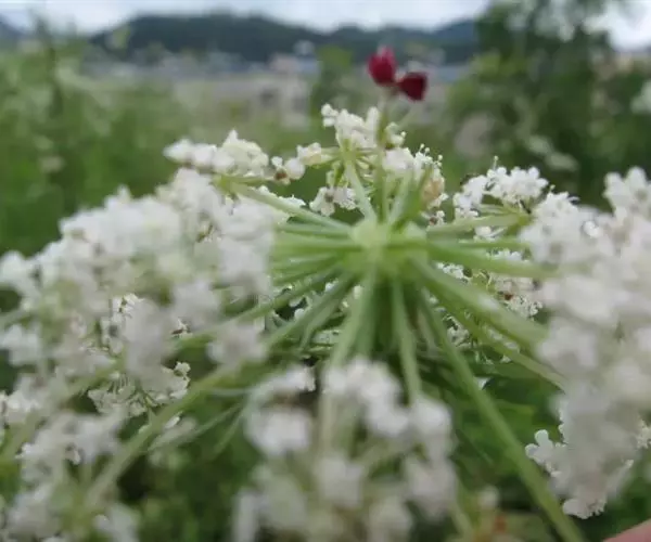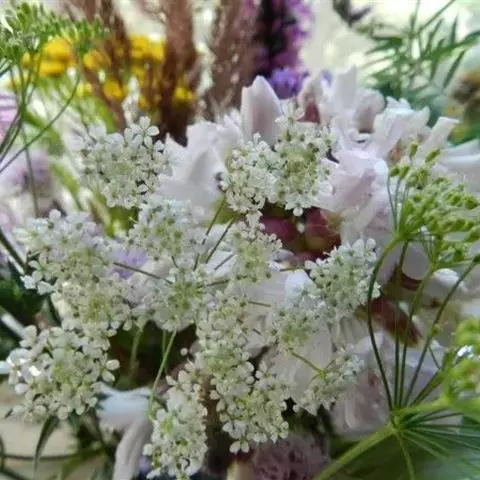 复伞形花序,花序梗长10-55厘米,有糙硬毛;总苞有多数苞片,呈叶状,羽状分裂,少有不裂的,裂片线形,长3-30毫米;伞辐多数,长2-7.5厘米,结果时外缘的伞辐向内弯曲;小总苞片5-7,线形,不分裂或2-3裂,边缘膜质,具纤毛;花通常白色,有时带淡红色;花柄不等长,长3-10毫米。果实圆卵形,长3-4毫米,宽2毫米,棱上有白色刺毛。花期5-7月。