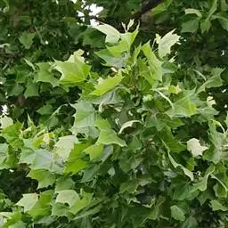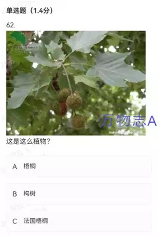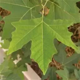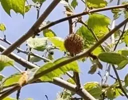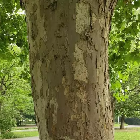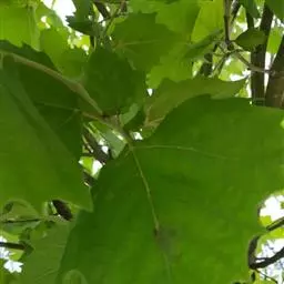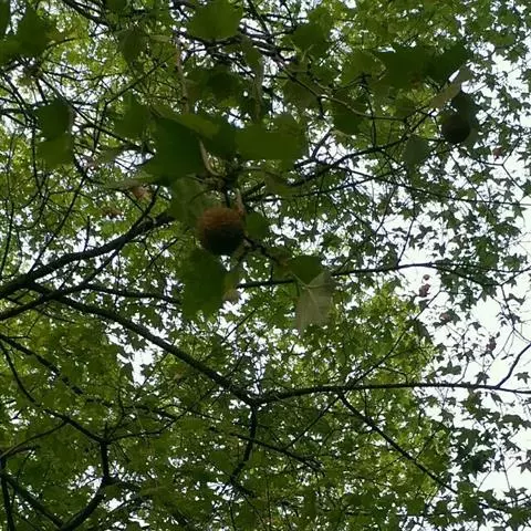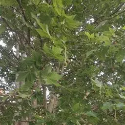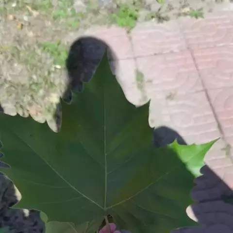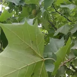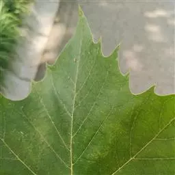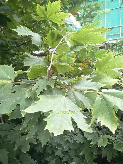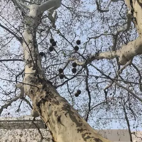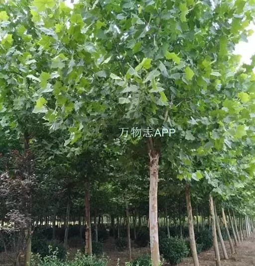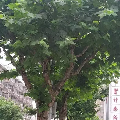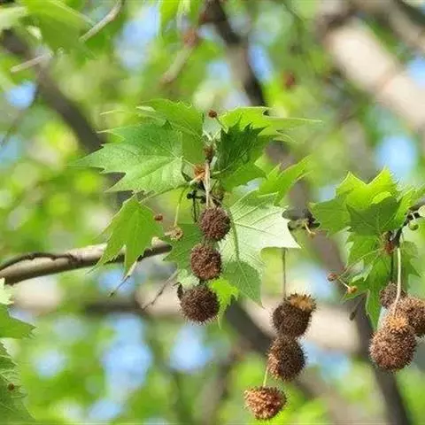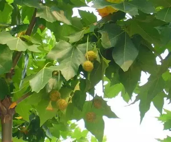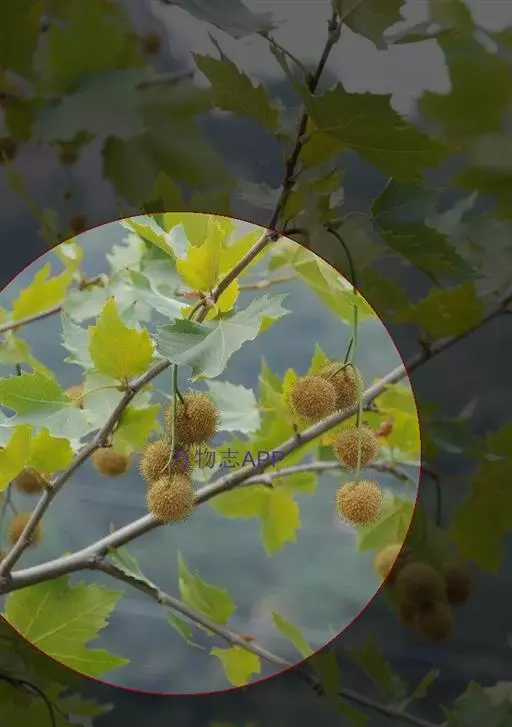 其树冠阔钟形;干皮灰褐色至灰白色,呈薄片状剥落。幼枝、幼叶密生褐色星状毛。叶掌状5-7裂,深裂达中部,裂片长大于宽,叶基阔楔形或截形,叶缘有齿牙,掌状脉;托叶圆领状。花序头状,黄绿色。多数坚果聚全叶球形,3-6球成一串,宿存花柱长,呈刺毛状,果柄长而下垂。