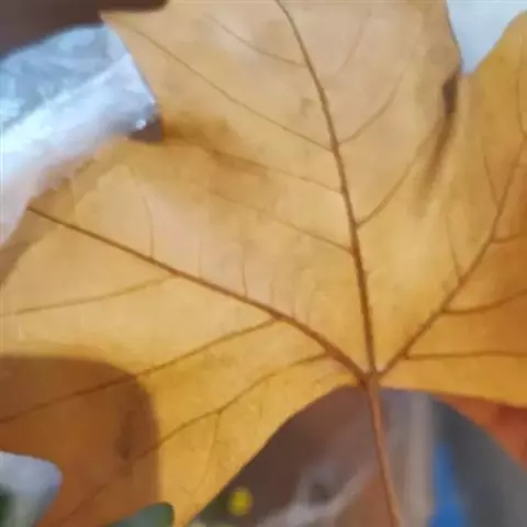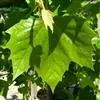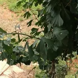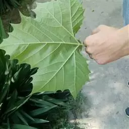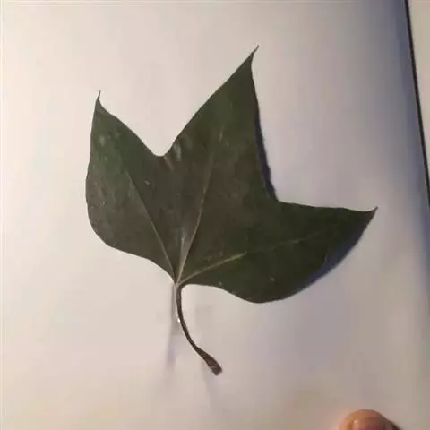 叶大,轮廓阔卵形,宽9-18厘米,长8-16厘米,基部浅三角状心形,或近于平截,上部掌状5-7裂,稀为3裂,中央裂片深裂过半,长7-9厘米,宽4-6厘米,两侧裂片稍短,边缘有少数裂片状粗齿,上下两面初时被灰黄色毛被,以后脱落,仅在背脉上有毛,掌状脉5条或3条,从基部发出;叶柄长3-8厘米,圆柱形,被绒毛,基部膨大;托叶小,短于1厘米,基部鞘状。