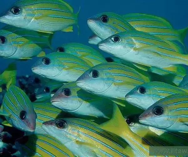 鱼体亮黄色,体侧有4条蓝色纵带,幼鱼时在第2、3纵带间有一黑斑。栖息于珊瑚礁周边100m处。性格凶猛,以无脊椎动物、鱼类为食。