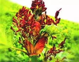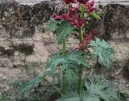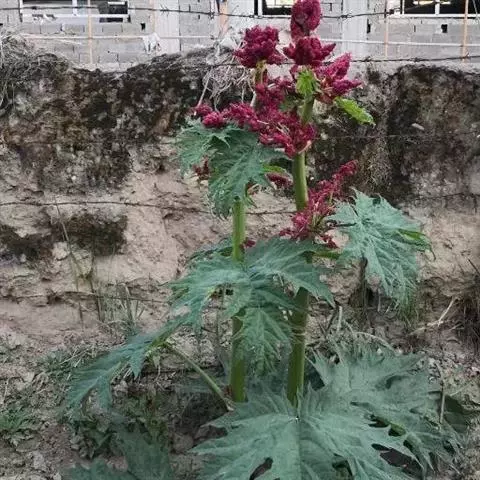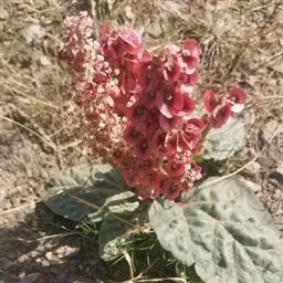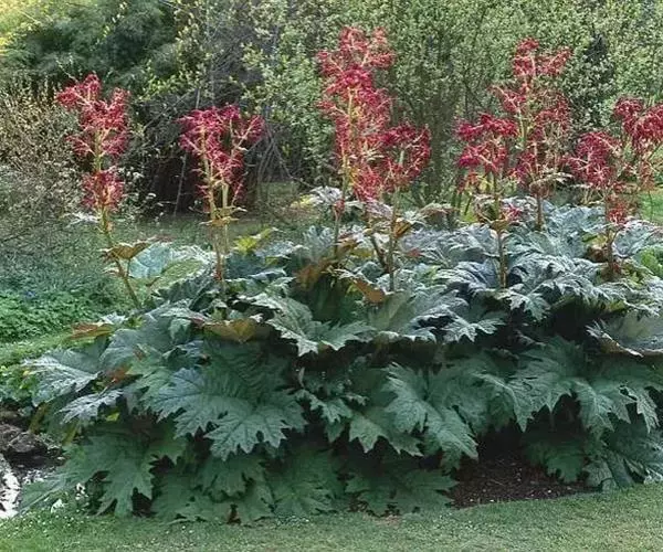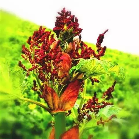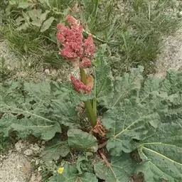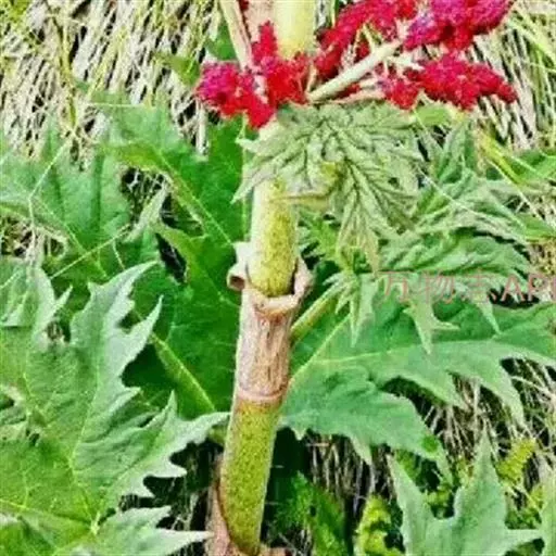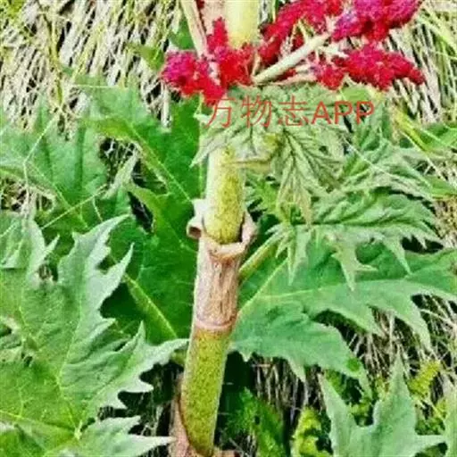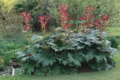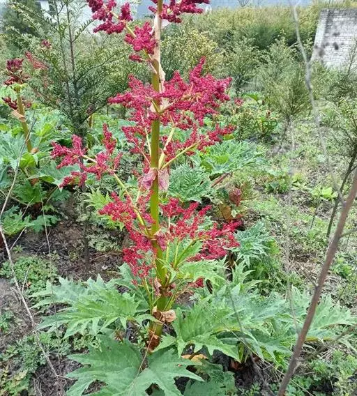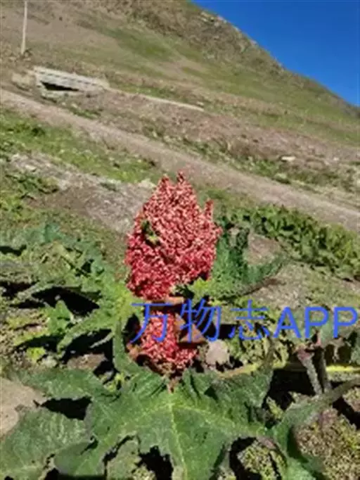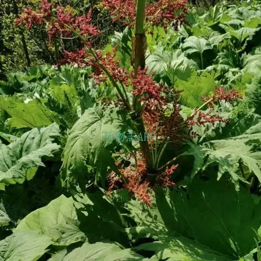 掌叶大黄(Rheum palmatum L.)蓼科,大黄属高大粗壮草本植物,高可达2米,粗壮木质根状茎。茎直立中空,叶片长宽近相等,基部近心形,叶上面粗糙到具乳突状毛,叶柄粗壮,圆柱状,与叶片近等长,托叶鞘大,内光滑,外粗糙。圆锥花序,花小, 通常紫红色,有时黄白色;花梗关节位于中部以下;花被片外轮较窄,内轮较大,宽椭圆形到近圆形,雄蕊不外露,与花丝基部粘连;子房菱状宽卵形,果实矩圆状椭圆形到矩圆形,种子宽卵形,棕黑色。6月开花,8月结果。