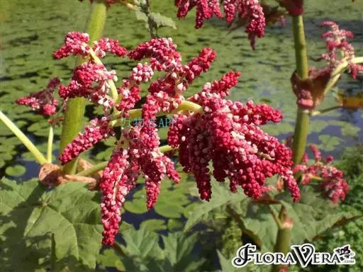 高大粗壮草本,高1.5-2米,根及根状茎粗壮木质。茎直立中空,叶片长宽近相等,长达40-60厘米,有时长稍大于宽,顶端窄渐尖或窄急尖,基部近心形,通常成掌状半5裂,每一大裂片又分为近羽状的窄三角形小裂片,基出脉多为5条,叶上面粗糙到具乳突状毛,下面及边缘密被短毛;叶柄粗壮,圆柱状,与叶片近等长,密被锈乳突状毛;茎生叶向上渐小,柄亦渐短;托叶鞘大,长达15厘米,内面光滑,外表粗糙。大型圆锥花序,分枝较聚拢,密被粗糙短毛;花小, 通常为紫红色,有时黄白色;花梗长2-2.5毫米,关节位于中部以下;花被片6, 外轮3片较窄小,内轮3片较大,宽椭圆形到近圆形,长1-1.5毫米;雄蕊9, 不外露;花盘薄,与花丝基部粘连;子房菱状宽卵形,花柱略反曲,柱头头状。果实矩圆状椭圆形到矩圆形,长8-9毫米,宽7-7.5毫米,两端均下凹,翅宽约2.5毫米,纵脉靠近翅的边缘。种子宽卵形,棕黑色。花期6月,果期8月。果期果序的分枝直而聚拢。