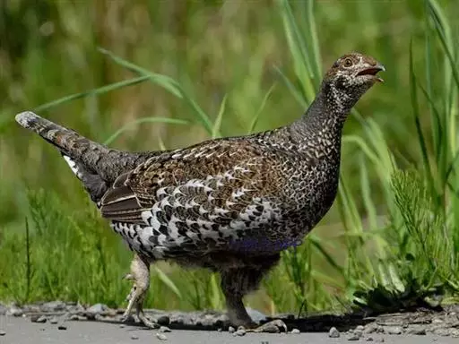 松鸡雄鸟从额到尾上覆羽都是石板灰色,头部的颜色较暗,上面有黑色的虫蠹状斑或云雾状斑。喉部黑色,胸部有蓝绿色的光泽,腹部有白色的斑点。尾长而宽阔,具有一些白色斑点,在中央尾羽上有一条宽的不规则白斑。雌鸟的上体是锈褐色,夹杂着黑色及皮黄色的的横斑,下体较淡,喉部淡黄或橙黄色,胸部棕色,腹部和两胁淡白色,密布着黄褐色的横斑。虹膜褐色,嘴角黄色或白色,跗蹠被羽到趾。