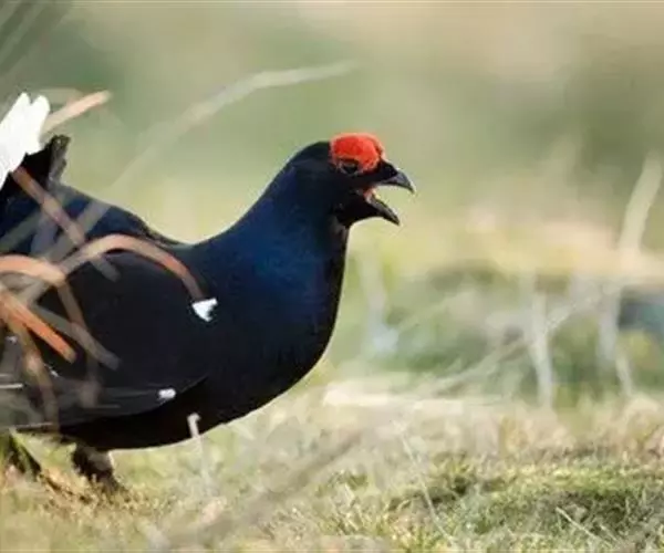 求偶场中的雄鸟们都保持一定的距离,大约为50-100米。由于地势复杂,雄鸟们在各自的领域中进行性表演时彼此是很难看到的,但能听到彼此的求偶叫声。雄鸟的求偶叫声分为4部分:第1部分可以省略,第2部分为双音节的ki-kop。这2个音节逐渐加快,产生类似火车奔驰的声音,第3部分为软木塞被拔出瓶口时的响声,第4部分声音频率最高,类似磨镰刀发出的声音。事实上,它们发出的许多叫声是人类无法听见的低频声音,但它们彼此之间却能辨别。每次表演大约为10分钟,然后走到离求偶场几十米远的灌丛或倒木堆附近觅食或歇息。
