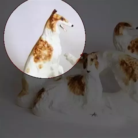 白色或白色带有灰色、红褐色或不同深浅的茶色斑纹。不同大小的斑纹可以出现在耳朵、头部(包括面具)、尾巴、及身体(很少的污迹)。底毛可以是白色或深色。上面描述的各种颜色和斑纹(位置)都是这一品种所特有的,没有好坏之分。缺陷:披毛的斑纹超过身体的1/3。
