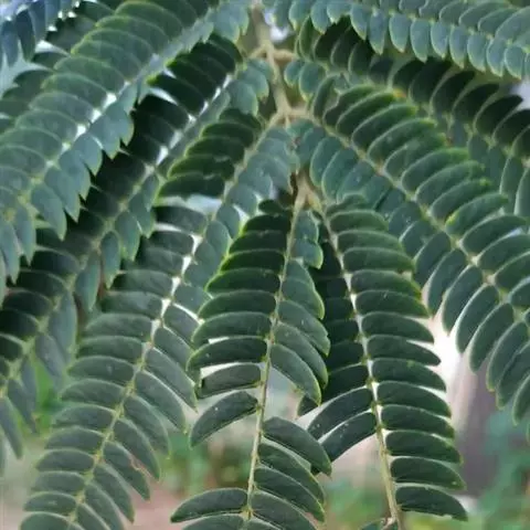托叶线状披针形,较小叶小,早落;二回羽状复叶,互生;总叶柄长3-5cm,总花柄近基部及最顶1对羽片着生处各有一枚腺体;羽片4-12对,栽培的有时达20对;小叶10-30对,线形至长圆形,长6-12mm,宽1-4mm,向上偏斜,先端有小尖头,有缘毛,有时在下面或仅中脉上有短柔毛;中脉紧靠上边缘。