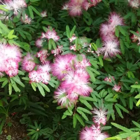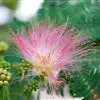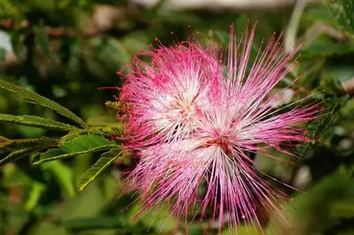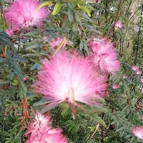 合欢(Albizia julibrissin Durazz.), 又名绒花树,马缨花。落叶乔木,夏季开花,头状花序,合瓣花冠,雄蕊多条,淡红色。荚果条形,扁平,不裂。高4-15米。树冠开展;小枝有棱角,嫩枝、花序和叶轴被绒毛或短柔毛。托叶线状披针形;头状花序于枝顶排成圆锥花序;花粉红色;花萼管状,花期6-7月;果期8-10月。