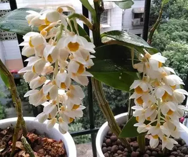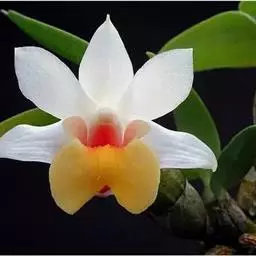 聚伞石斛(D.thyrsiflorum),花白色,唇瓣金黄色。