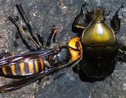 金环胡蜂是胡蜂科、胡蜂属昆虫。雌蜂体长约40毫米,工蜂体长25毫米,雌蜂体黑褐色,头部橙黄色,…