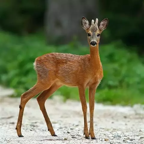 赤麂脸部较为狭长,前额至吻部毛色微黑,自眶下腺至角分叉处每侧有一条较阔而明显的额腺,额腺较长而最后交叉在一起成“v”形。四肢细长。雄兽有角,单叉型,角短而直向后伸展,角基长、角尖向内弯,二尖相对。雌兽无角,但其额顶与雄兽生角相应部位微有突起,且着生特殊成束的黑毛,如同角茸。