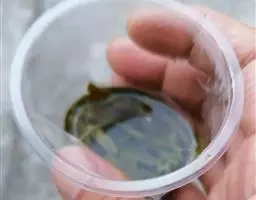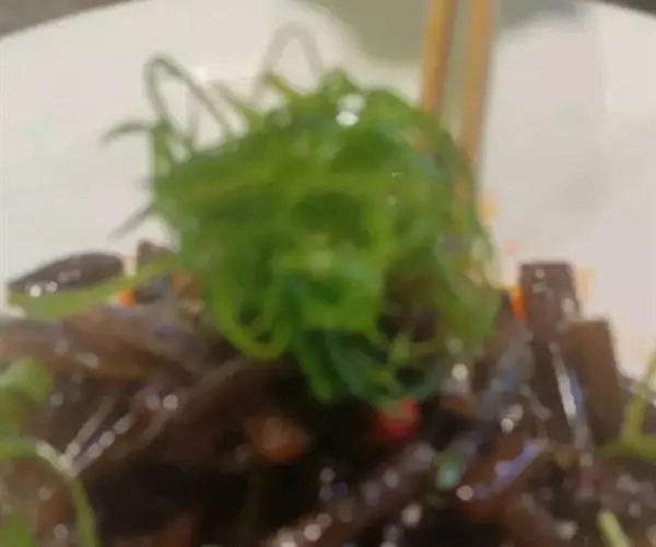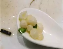 4、蕨根粉捞出放盘子内,倒入调味汁,把蒜拍碎,洒在上面即可!