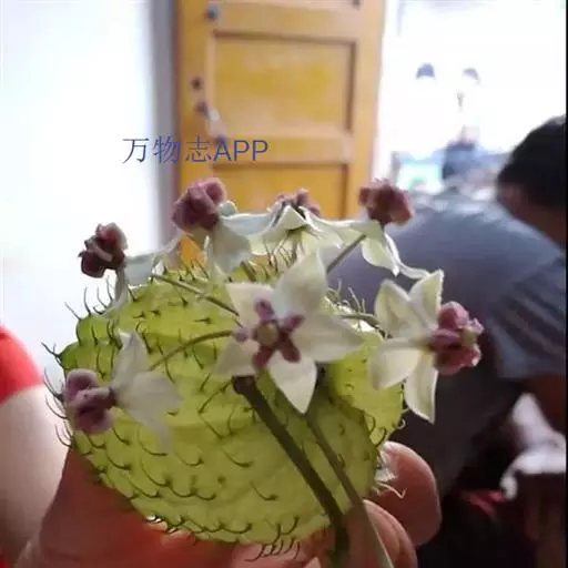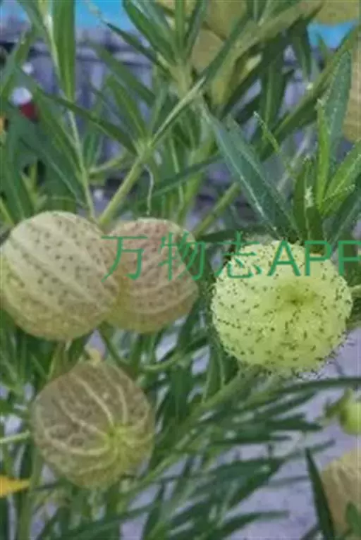 气球果(Asclepias fruticosa L.),萝摩科(Asclepiadaceae)亚灌木,高达1.8m,是一种奇特而有趣的观赏植物,在秋冬季节花、果并存,观赏期极长。原产热带非洲,华南植物园已有引种栽培。在我国北方常作盆栽,布置书房、客厅、阳台等处;在南方还可露地栽培点缀庭院、园林。
