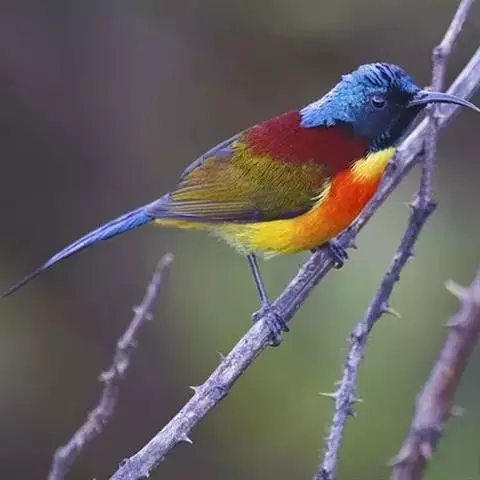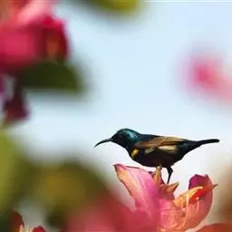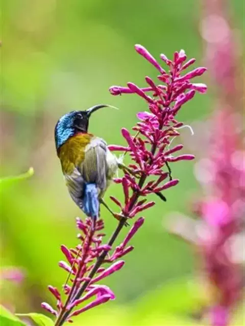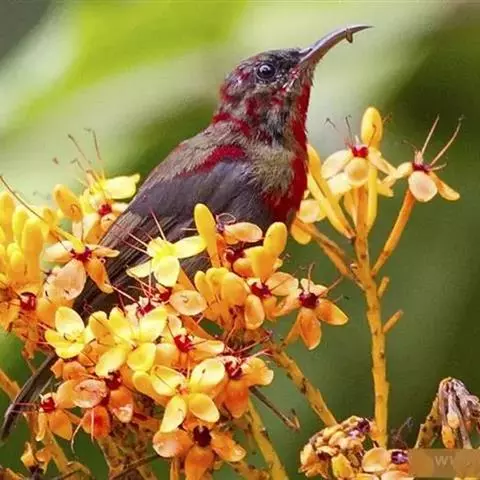 黑胸太阳鸟:小型鸟类,体长9-15厘米。嘴细长而向下曲。雄鸟中央尾羽特长,尾呈楔形,…