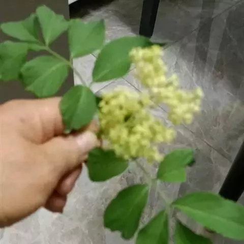 落叶乔木或大灌木,高4-10米;幼枝具纵条纹,二年生枝黄褐色,具明显凸起的圆形皮孔;髓部发达,白色。羽状复叶有小叶片1-3对,通常2对,具短柄,椭圆形或椭圆状卵形,长4-10厘米,宽2-3.5厘米,顶端尖或尾尖,边缘具锐锯齿,基部楔形或阔楔形至钝圆而两侧不等,揉碎后有恶臭,中脉基部、小叶柄基部及叶轴均被短柔毛:托叶叶状或退化成腺形。圆锥形聚伞花序分枝5出,平散,直径达12厘米;花小而多;萼筒长于萼齿;花冠黄白色,裂片长矩圆形;雄蕊花丝丝状,花药黄色;子房3室,花柱短,柱头3裂。果实亮黑色。花期4-5月,果熟期7-8月。 [1-2]