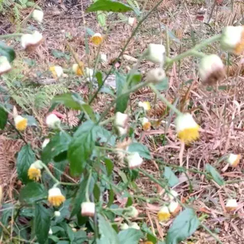 花:头状花序多数,径6-8毫米,排列顶生、疏或密的长圆形的大圆锥花序;花序梗长8-15毫米,被具柄腺毛和长柔毛;总苞圆柱形至钟形,长约9毫米;总苞片5-6层,带紫红色,花后常反折,外层线形,顶端稍钝,背面被密短柔毛或有时被具柄腺毛,长2-4毫米,中层长圆状披针形,长4-6毫米,渐尖,边缘干膜质,内层线形,长约9毫米,背面上部被疏毛;花托扁平至微凸,径2.5-5毫米,蜂窝状,窝孔周围被短柔毛。花黄色;雌花多数,花冠细管状,长约1毫米,檐部2-3齿裂,裂片无毛;两性花花冠管状,约与雌花等长,上部渐宽,檐部5裂,裂片三角形,被疏毛。