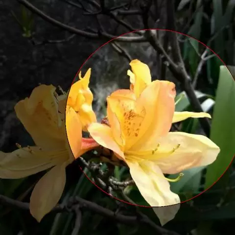 花单生或2~7朵排列成总状花序;苞片叶状,披针形,长4.5~5.5cm,宽0.8~1.5cm;花梗长2~8.5cm;花橙黄色或橙红色,有紫红色斑点;花被片长椭圆形,长4.8~5.2cm,宽1.2~1.4cm,蜜腺两边无乳头状突起;花丝长3cm,无毛,花药橙黄色;子房圆柱形,长8~12mm,宽3~4mm;花柱长为子房的2倍,柱头膨大,常3裂。