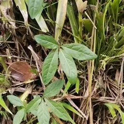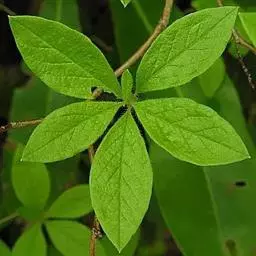 掌状复叶,对生,叶片卵形,渐尖,被细毛,缘具齿,叶柄长。
