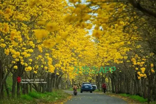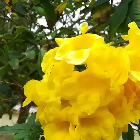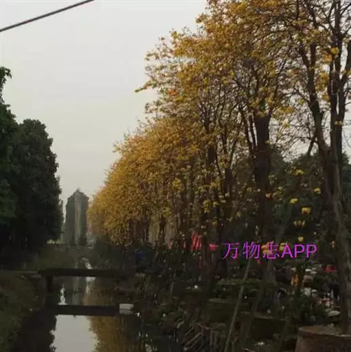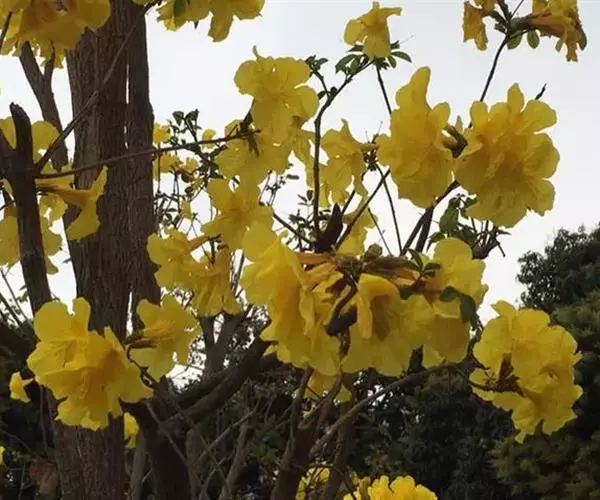 黄金风铃木(学名:Tabebuia chrysantha(Jacq. )Nichols),别称:黄花风铃木、黄丝风铃木、金花风铃木、伊蓓树、毛风铃、巴西风铃木。原产墨西哥、中美洲、南美洲,是巴西的国花。每年3、4月开花,花冠漏斗形、五裂,似风铃状,花缘皱曲,花色金黄。开花时只见花而不见叶,花期仅十余天。蓇葖果,开裂时果荚多重反卷,向下开裂,种子带薄翅,有许多绒毛以利种子散播。黄花风铃木以不同风貌渲染四季:春天枝稀叶疏,倾情绽放美丽的花朵;夏天生叶结出果荚;秋天枝叶繁茂,一片绿油油的景象;冬天则落尽叶子,呈现凄凉之美。