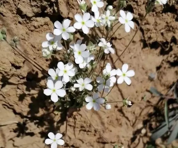点地梅 花葶通常数条由基部叶腋抽出,长(3)5-15厘米,伞形花序通常有4-10朵花,苞片数枚,卵形至披针形,长3-4毫米,宽0.5-1.5毫米,先端渐尖;花梗纤细,长1-3(5)厘米,通常花后伸长达6厘米,开展,混生腺毛;花萼杯状,5深裂几达基部,裂片卵形,长2-3.5毫米,果期增大,长4-5毫米,呈星状水平展开,具3-6条明显纵脉,花冠通常白色、淡粉白色或淡紫白色,花冠筒状,长约2毫米,筒部短于花萼,喉部黄色,裂片与花冠筒近等长或稍长,倒卵状长圆形,长2.5-3毫米,宽1.5-2毫米,明显超出花冠;雄蕊着生于花冠筒中部,长约1.5毫米;子房球形,花柱极短。