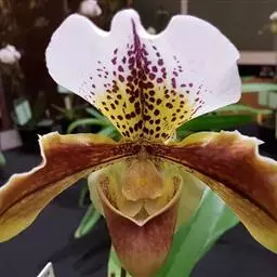 虎斑兜兰(学名:Paphiopedilum markianum)兰科,兜兰属地生或半附生植物。叶基生;数枚至多枚,叶片带形、革质。花葶从叶丛中长出,花苞片非叶状;子房顶端常收狭成喙状;花大而艳丽,有种种色泽;中萼直立,花粉粉质或带粘性,退化雄蕊扁平;柱头肥厚,下弯,柱头面有乳突,果实为蒴果。6-8月开花。