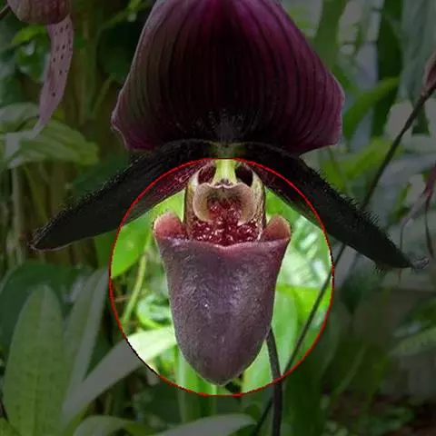 花葶直立,长20-25厘米,紫色,被短柔毛,顶端生1花;花苞片近椭圆形,长3.5-6厘米,宽1-1.5厘米,绿色而具紫点;花梗和子房长3.5-4.5厘米,被短柔毛;花大;中萼片黄绿色而有3条紫褐色粗纵条纹,合萼片淡黄绿色并在基部有紫褐色细纹,花瓣基部至中部黄绿色并在中央有2条紫褐色粗纵条纹,上部淡紫红色,唇瓣淡黄绿色而有淡褐色晕,退化雄蕊黄绿色但在中央有紫斑;中萼片宽卵形至极宽的倒卵形,长4-4.5厘米,宽2.8-4厘米,先端常有短尖头,背面有微柔毛;合萼片椭圆状卵形,长3-4厘米,宽约2厘米,背面亦被毛;花瓣近匙形,长6-6.5厘米,宽3-4厘米,边缘(尤其中部至基部)波状;唇瓣倒盔状,基部有宽阔的、长1.5-2厘米的柄;囊近椭圆形,向末端略变狭,长2.5-3厘米,宽2-2.5厘米,囊口极宽阔,两侧各有1个直立的耳,两耳前方的边缘不内折,囊底具毛;退化雄蕊近椭圆形或倒卵状椭圆形,长1.2-1.5厘米,宽8-9毫米,中央具脐形突起。花期6-8月。
