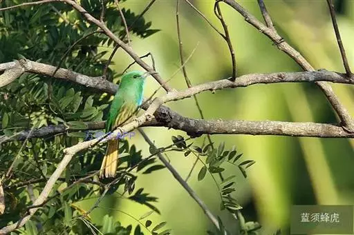 黄喉蜂虎属中型鸟类,体长23-30厘米。喉黄色,其下有一窄的黑色胸带;胸带以下的整个下体蓝绿色。…
