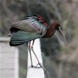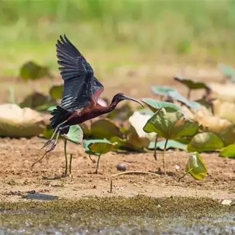 黑鹮(学名:Pseudibis papillosa):是鹳形目鹮科动物。体长600-680毫米,是一种大型涉禽。特征为头裸出,皮肤黑;体羽几乎全为深褐色,内侧小覆羽白,肩部具白色斑块,腿红色,颈背具浅蓝色斑块。通体体羽深褐,两翼及尾黑色具蓝色金属光泽,下体无栗色。 虹膜橙红色,嘴铅蓝黑色,脚和趾淡粉红色。