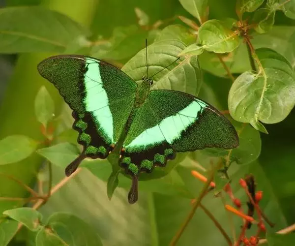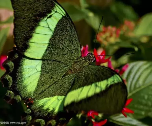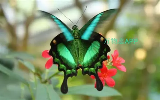 形态 成虫:翅展90—135 mm。体、翅黑色,满布翠绿色鳞片,在脉纹间更集中,已表现出翠绿带。雄蝶前翅在cu2—m3室有天鹅绒状的性标。后翅翠绿色鳞片有的均匀地散布,有的集中在基半部,有的集中在上角附近呈翠蓝色,有的集中在中后区的上半部。亚外缘有1列弯月形蓝色斑纹和红色斑纹;外缘波状;臀角有红色环形斑纹。翅反面前翅亚外缘区有灰黄或灰白色宽带,由后缘向前缘放射,越接近前缘越宽,颜色、越淡。后翅亚外缘区红色月牙形或钩形斑纹十分明显。其余与正面相似。
