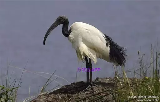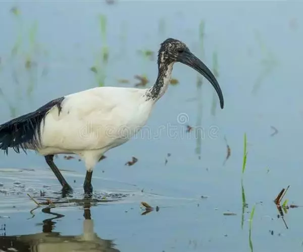 圣鹮头、颈黑色,身体白色,初级和次级飞羽尖端黑色。喙长且厚、黑色下弯,跗蹠与趾黑色。…
