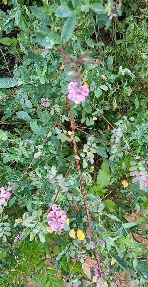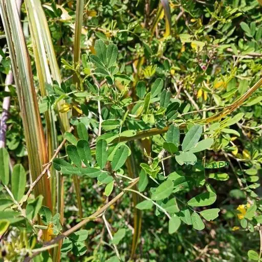 小灌木,高50-80cm,罕更高。茎直立,小枝被银白色丁字毛。叶互生;叶柄长1.3-2.5cm;托叶小,锥形;奇数羽状复叶,长2.5-5cm,小叶对生,小叶9-13片,叶片卵状长圆形或倒卵状椭圆形,长1.5-3cm,宽0.5-1.5cm,先端钝圆,有小尖,基部楔形,全缘,两面被丁字毛,叶干时常带蓝色。总状花序长2.5-5cm,通常腋生,远较叶为短,花疏生,有花约20朵;萼钟形,斜形,被银白色丁字毛,5齿裂;花冠蝶形,红黄色,长约4mm,旗瓣宽卵形至长圆形,外面有毛,翼瓣卵圆形,微与龙骨瓣相连,龙骨瓣匙形,爪上有距;雄蕊10,二体;子房无柄,花柱短,内弯,柱头头状。荚果线状圆柱形,直或稍弯,长约2.5-3cm,种子间有缢缩,外形似串珠,有毛或无毛。有种子5-10颗。种子长圆形,长约1.5mm。花期5-10月,果期6-11月。
