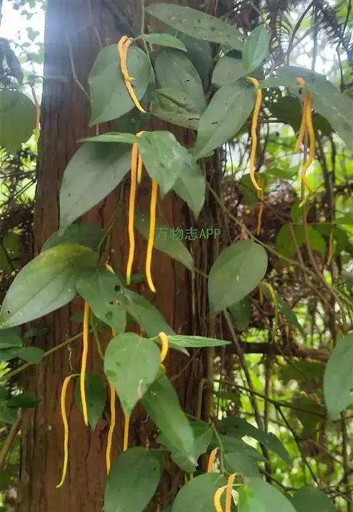 攀援藤本,长数至10余米,除花序轴和苞片柄外,余均无毛;茎、枝具细纵纹,节上生根。叶纸质或近革质,卵状披针形或椭圆形,少有披针形,长6-12厘米,宽2.5-4.5厘米,顶端短尖或渐尖,基部渐狭或楔形,有时钝,通常相等或有时略不等;叶脉5-7条,最上1对互生,离基1-3厘米从中脉发出,弯拱上升几达叶片顶部,如为7脉时,则最外1对细弱,网状脉通常明显;叶柄长5-12毫米;叶鞘长约为叶柄之半。