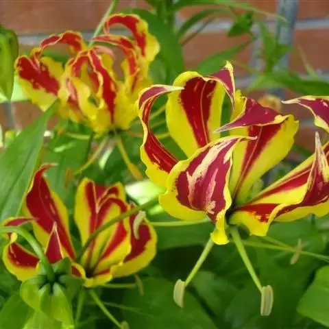 嘉兰 攀援植物;根状茎块状、肉质,常分叉,粗约1厘米。茎长2-3米或更长。叶通常互生,有时兼有对生的,披针形,长7-13厘米,先端尾状并延伸成很长的卷须(最下部的叶例外),基部有短柄。花美丽,单生于上部叶腋或叶腋附近,有时在枝的末端近伞房状排列;花梗长可达10-15厘米;花被片条状披针形,长4.5-5厘米,宽约8毫米,反折,由于花俯垂而向上举,基部收狭而多少呈柄状,边缘皱波状,上半部亮红色,下半部黄色,宿存;花丝长3-4厘米,花药条形,长约1厘米;花柱丝状,与花丝近等长,分裂部分长约6-7毫米。 [1-2]