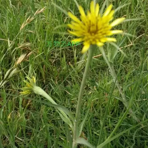 二年生草本,高30-60 (90)厘米。根圆柱状,垂直直伸,根颈被残存的基生叶柄。茎直立,不分枝或分枝,有纵条纹,无毛。基生叶及下部茎叶线形或线状披针形,长10-25(40)厘米,宽3-18(24)毫米,灰绿色,先端渐尖,全缘或皱波状,基部宽,半抱茎;中部及上部茎叶披针形或线形,长3-8厘米,宽3-10毫米。头状花序单生茎顶或植株含少数头状花序,生枝端。总苞圆柱状,长2-3厘米。总苞片8-10枚,披针形或线状披针形,长1.5-3.5厘米,宽5-10毫米,先端渐尖,边缘狭膜质,基部棕褐色。舌状小花黄色。瘦果长纺锤形,褐色,稍弯曲,长1.5-2厘米,有纵肋,沿肋有疣状突起,上部渐狭成细喙,喙长6-8毫米,顶端稍增粗,与冠毛连接处有蛛丝状毛环。冠毛淡黄色,长1-1.5厘米。花果期5-9月。