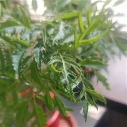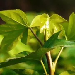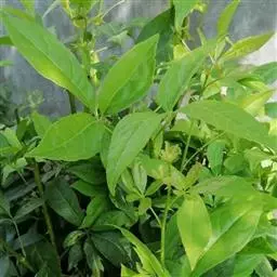 叶互生,掌状复叶,小叶5枚,线状披针形,近先端边缘有疏细锯齿,革质,叶面具有金黄色斑纹。