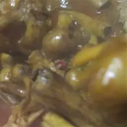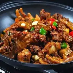 重口味做法):蒜瓣八个,姜一块切片,葱一个切段,五克花椒,十五克八角,起锅烧油六十克,放入材料,炸香后放入小鸡翻炒,放入老抽,味精,盐,酱油,翻炒五分钟兑水小火慢炖,准备配菜干香菇三十克,泡水三十分钟后下锅,然后和三百克面粉,水熬干后把面饼贴上盖上锅盖煮十分钟,加少量淀粉一百五十克水,开锅后放入辣椒,随自己口味放入辣椒。就可以出锅了。