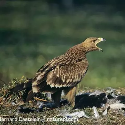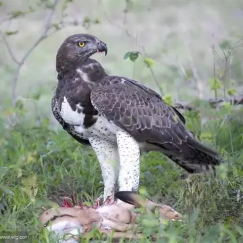 白肩雕:又名御雕,是大型猛禽。体长73-84厘米。体羽黑褐色,头和颈较淡,肩部有明显的白斑,在黑褐…