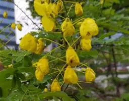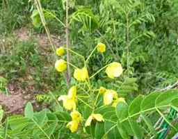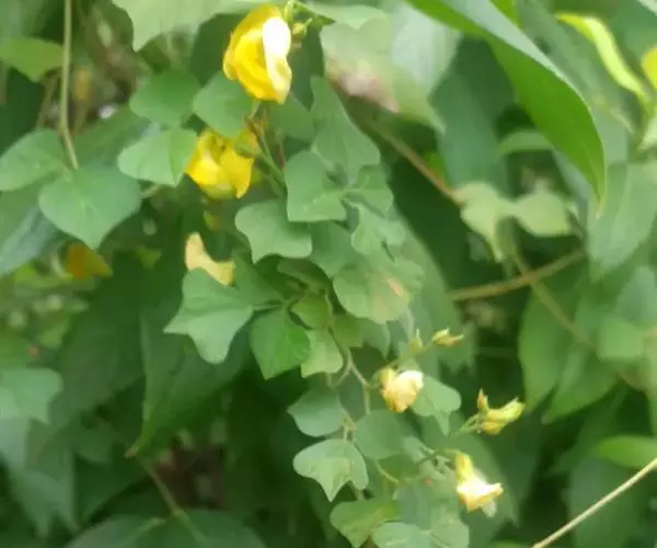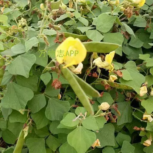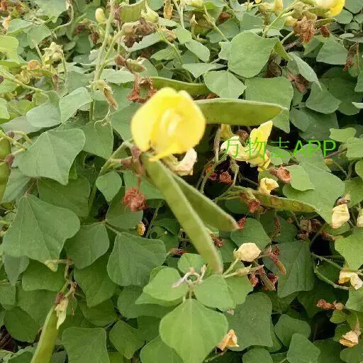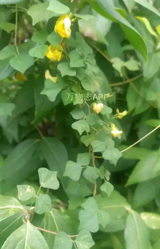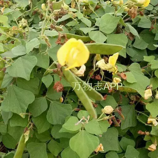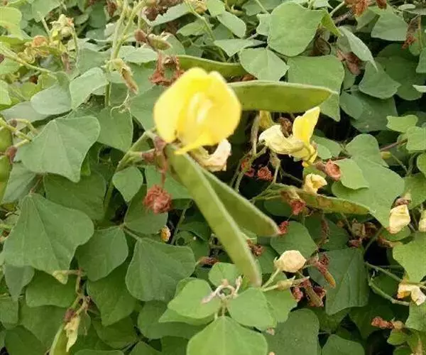 2、长柄野扁豆又名:水芽豆。多年生缠绕藤本,长1-4米。茎密被灰色短柔毛,具纵棱,棱上被毛较密。叶具羽状3小叶;托叶小,早落;叶柄长1.5-4厘米,密被短柔毛;顶生小叶菱形,长和宽约3-4厘米,先端急尖,基部钝、圆形或有时近截平,侧生小叶较小,斜卵形,两面均密被灰色短柔毛,下面有红色腺点;基出脉3,侧脉每边1-3条;小托叶常缺;小叶柄长1-2毫米,与叶柄同被灰色短柔毛。短总状花序腋生;有花1-2朵,稀3-4朵;花长1.5-2厘米;总花梗长0.5-1厘米;花梗长2-6毫米,均密被灰色短柔毛;花萼钟状,萼齿卵状披针形,被短柔毛及有橙黄色腺点;花冠黄色,旗瓣横椭圆形,宽大于长,基部有2耳,冀瓣窄椭圆形,基部一侧具下弯的耳,龙骨瓣极弯曲,具长喙,无耳;雄蕊二体;子房密被丝质柔毛及橙黄色腺点,具柄,有胚珠9-11颗。荚果线状长圆形,长5-8厘米,宽0.9-1.1厘米,密被灰色短柔毛和橙黄色细小腺点,先端具长喙;果颈长1.5-1.7厘米;种子7-11颗,近圆形,扁平,黑色,长宽约4毫米。花、果期6-11月。