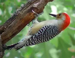 红腹啄木鸟成年雄鸟头项有红帽,翅膀和上体是黑白相间的斑纹状羽毛,腹部有一片红羽毛。头亦大,但颈较长,…