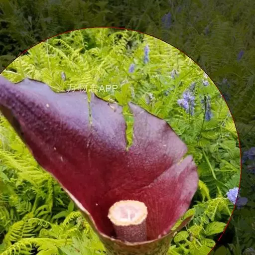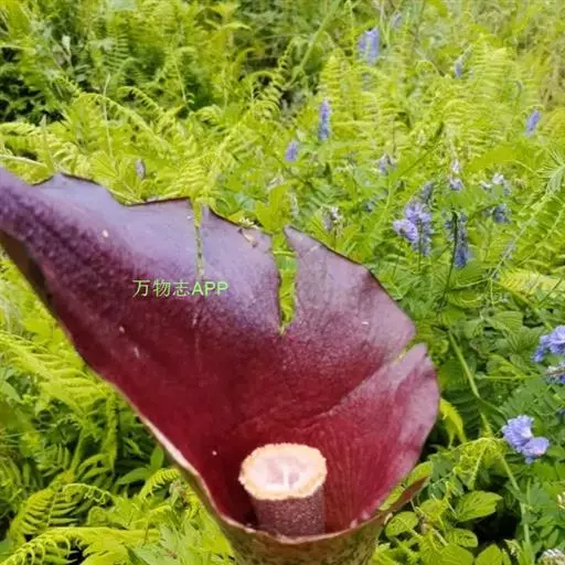 花序柄长50-70厘米,粗1.5-2厘米,色泽同叶柄。佛焰苞漏斗形,长20-30厘米,基部席卷,管部长6-8厘米,宽3-4厘米,苍绿色,杂以暗绿色斑块,边缘紫红色;檐部长15-20厘米,宽约15厘米,心状圆形,锐尖,边缘折波状,外面变绿色,内面深紫色。肉穗花序比佛焰苞长1倍,雌花序圆柱形,长约6厘米,粗3厘米,紫色;雄花序紧接(有时杂以少数两性花),长8厘米,粗2-2.3厘米;附属器伸长的圆锥形,长20-25厘米,中空,明显具小薄片或具棱状长圆形的不育花遗垫,深紫色。花丝长1毫米,宽2毫米,花药长2毫米。子房长约2毫米,苍绿色或紫红色,2室,胚珠极短,无柄,花柱与子房近等长,柱头边缘3裂。浆果球形或扁球形,成熟时黄绿色。花期4-6月,果8-9月成熟。