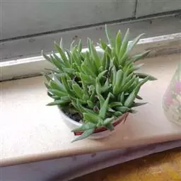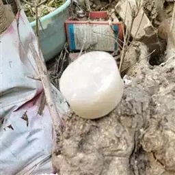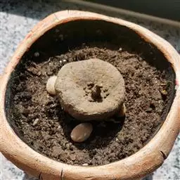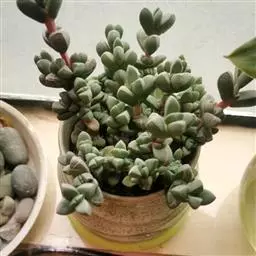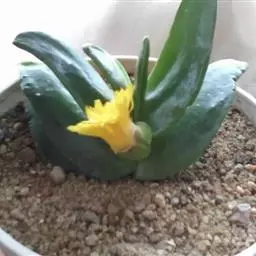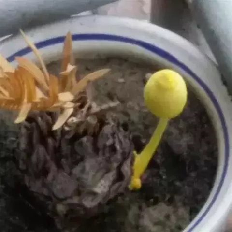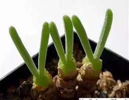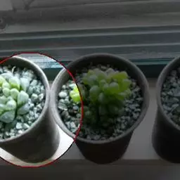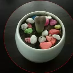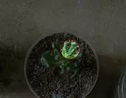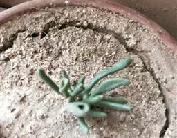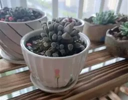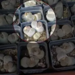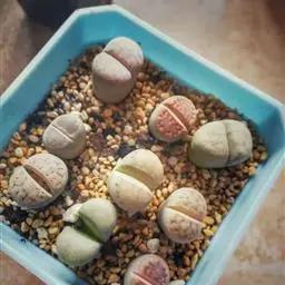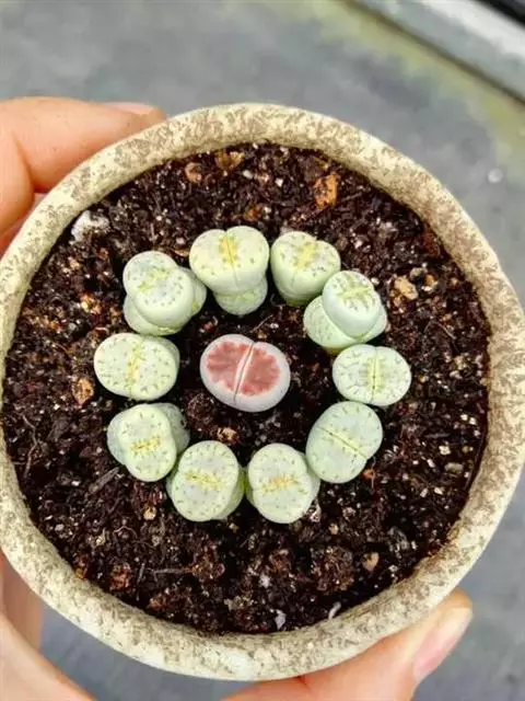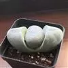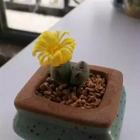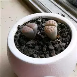 荒玉为番杏科生石花属,原产南非。株体呈白粉色,表面布满凹凸纹路,凹陷处为红褐色,每年秋季开黄花。