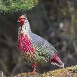 血雉(学名:Ithaginis cruentus),别名血鸡、松花鸡,血雉的雄鸟大覆羽、尾下覆羽、尾上覆羽、脚、头侧、腊膜为红色,故称血雉。其别名甚多,各地皆异。在甘肃,因其胸侧和翅上覆羽沾绿,被称为“绿鸡”;因其羽毛形似柳叶,且沾绿,又称为“柳鸡”;因其主要栖于松林和云杉林,食松(杉)叶和种子,又称为“松鸡子”;又因其脚红色,称“红脚鸡”者最为普遍。主要分布于中国,为国家二级保护动物,西部和西南部留鸟。