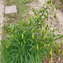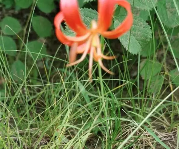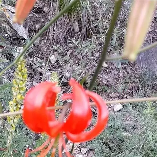 山丹百合 鳞茎卵形或圆锥形,高2.5-4.5厘米,直径2-3厘米;鳞片矩圆形或长卵形,长2-3.5厘米, 宽1-1.5厘米,白色。茎高15-60厘米,有小乳头状突起,有的带紫色条纹。叶散生于茎中部,条形,长3.5-9厘米,宽1.5-3毫米,中脉下面突出,边缘有乳头状突起。花单生或数朵排成总状花序,鲜红色,通常无斑点,有时有少数. 斑点,下垂;花被片反卷,长4-4.5厘米,宽0.8-1.1厘米,蜜腺两边有乳头状突起;花丝长1.2-2.5厘米,无毛,花药长椭圆形,长约1厘米,黄色,花粉近红色;子房圆柱形,长0.8-1厘米;花柱稍长于子房或长1倍多,长1.2-1.6厘米,柱头膨大,径5毫米,3裂。蒴果矩圆形,长2厘米,宽1.2-1.8厘米。花期7-8月,果期9-10月。