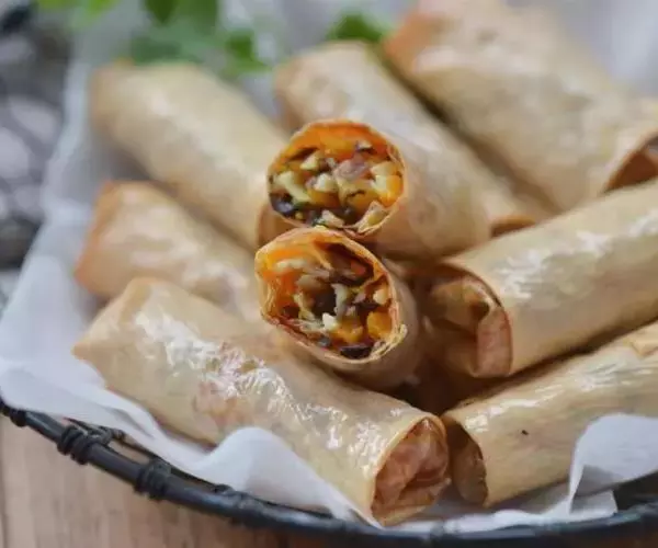 4. 烧热炒锅,下油约1/4杯,放入素菜卷煎至两面金黄色,盛出,斜切大段便可供食。