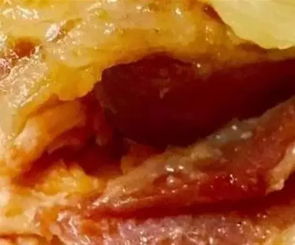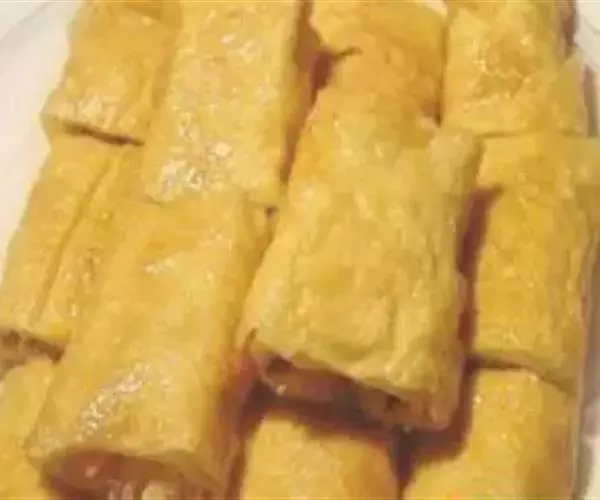 3. 豆腐皮(油皮)用湿布抹透至软,将馅料放入,卷成长条形,在收口处涂上粉浆待用。
